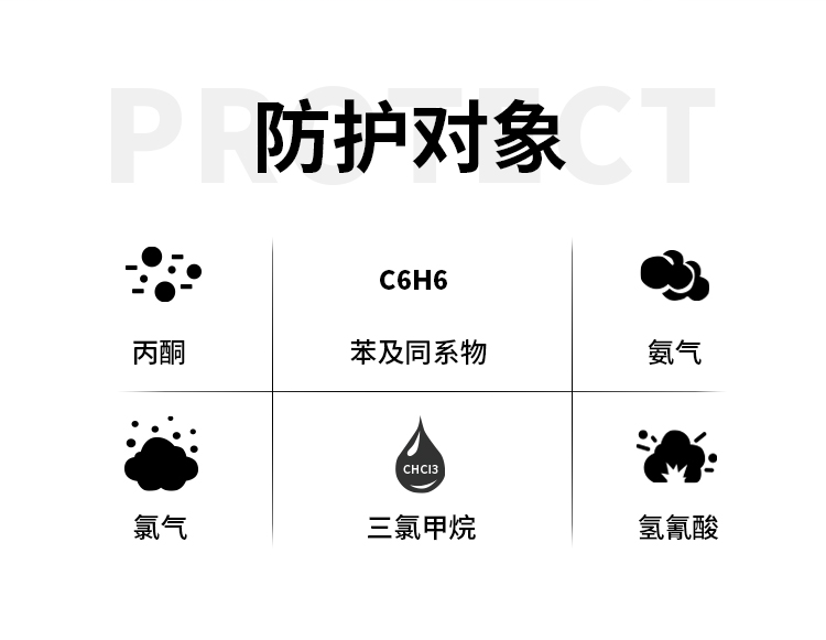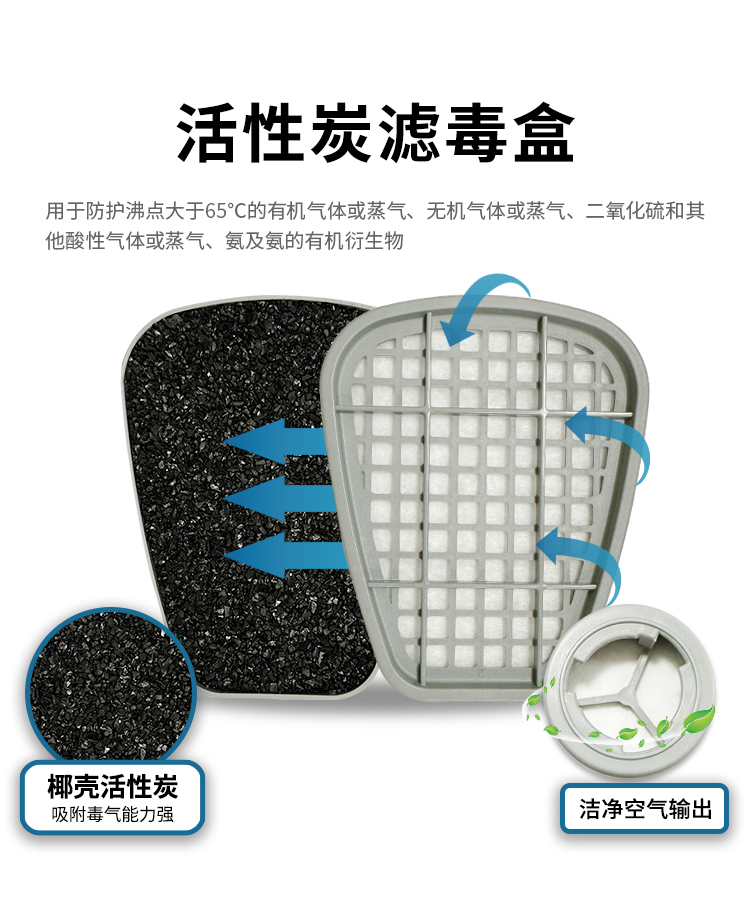 优质椰壳活性炭,防护时间长,吸附值高、活性炭化学浸渍,高效吸附分解有毒有害气体;