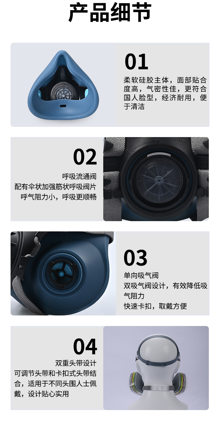 过滤件为梯形设计、重心后移、长时间佩戴不劳累,更符合人体工程学;