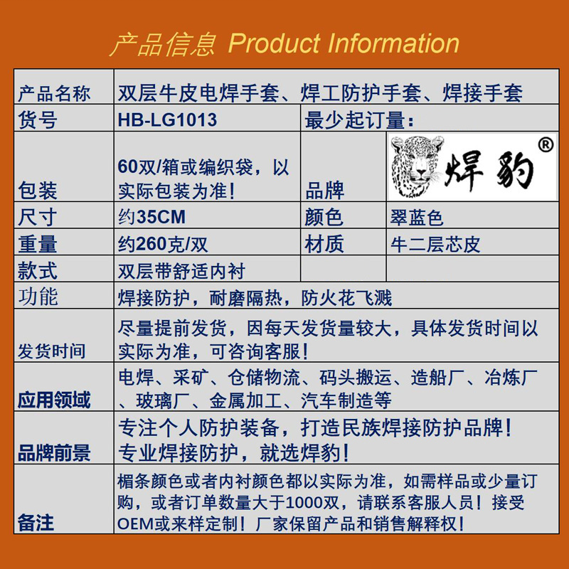 • 商品名称:焊豹 LG1013 翠蓝色牛皮双层电焊焊接手套 牛皮防护手套 35CM