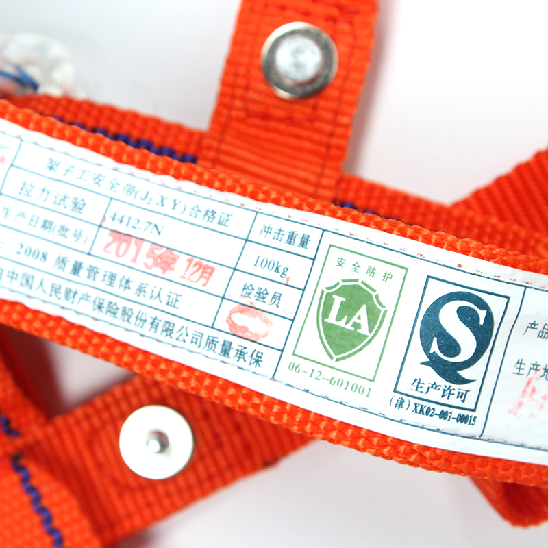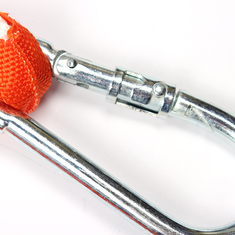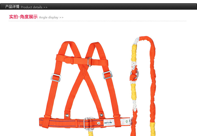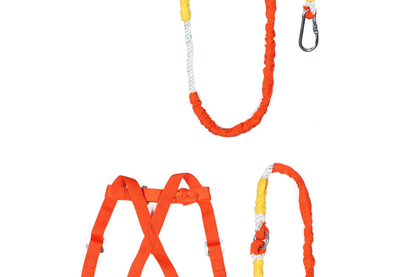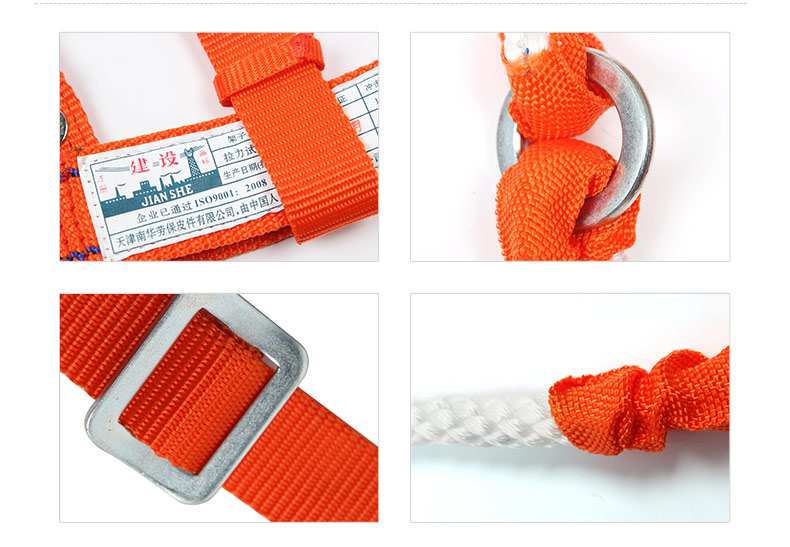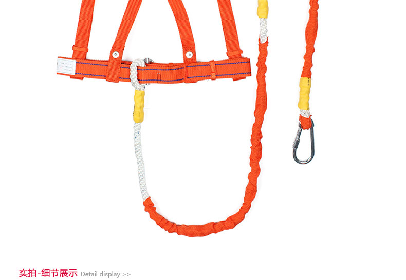 腰部配有一条14MM*2M的连接绳,和一只钢质安全钩,绳上的圆环是安全钩的回挂连接点;