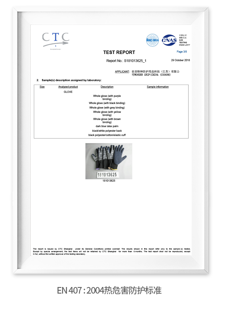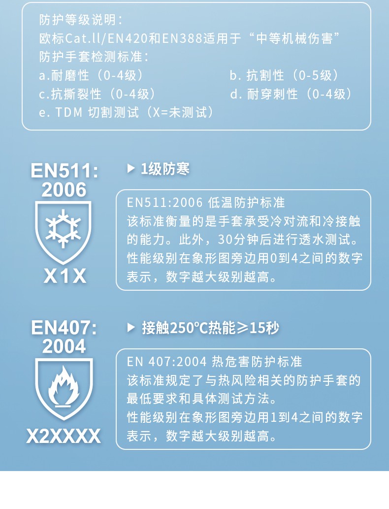 ●符合标准:EN388:2016、EN511:2006、EN407:2004;