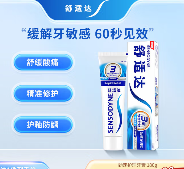 • 商品名称:舒适达 劲速护理 牙膏(抗敏含氟防蛀护龈)