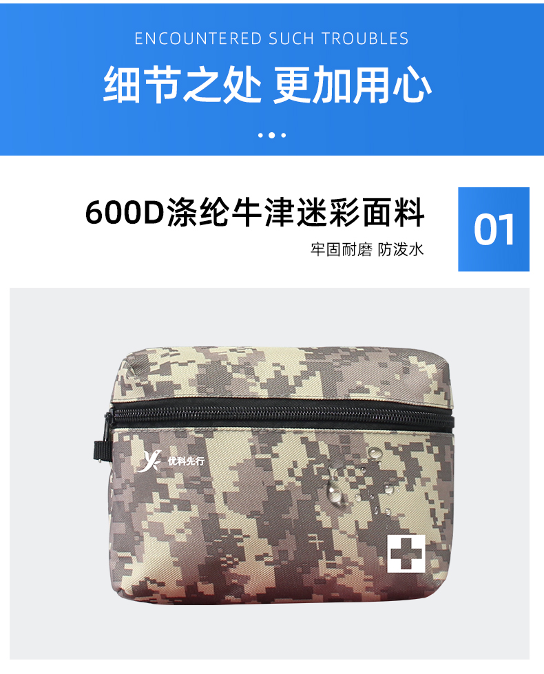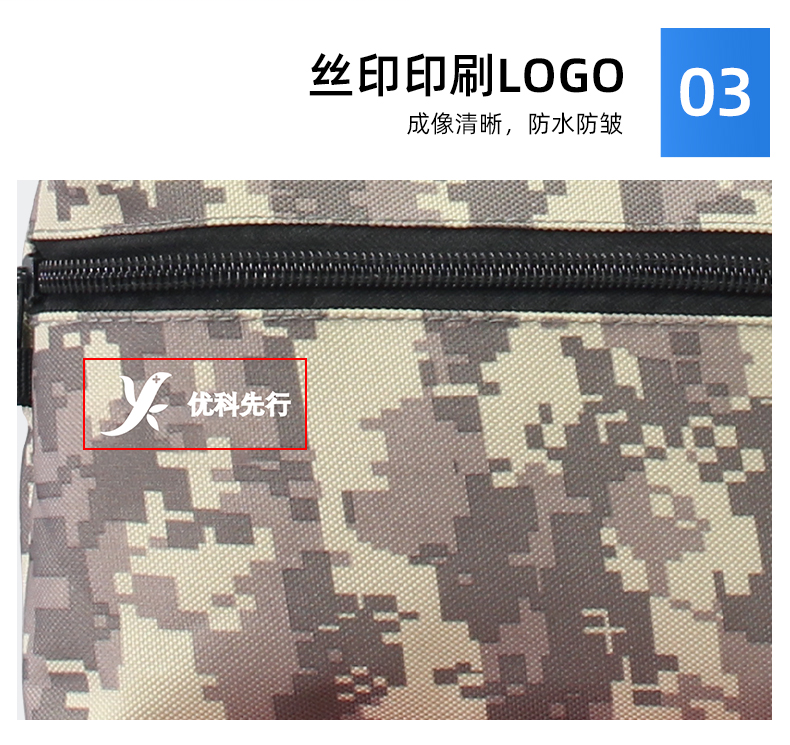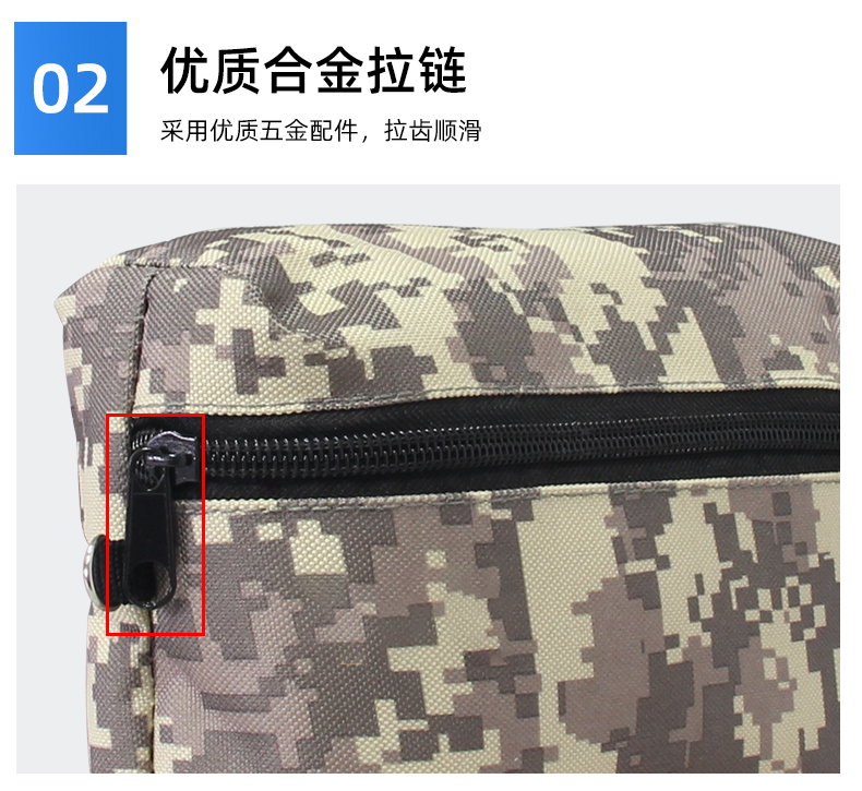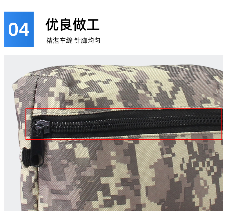 600D涤纶牛津迷彩面料,牢固耐磨防泼水。