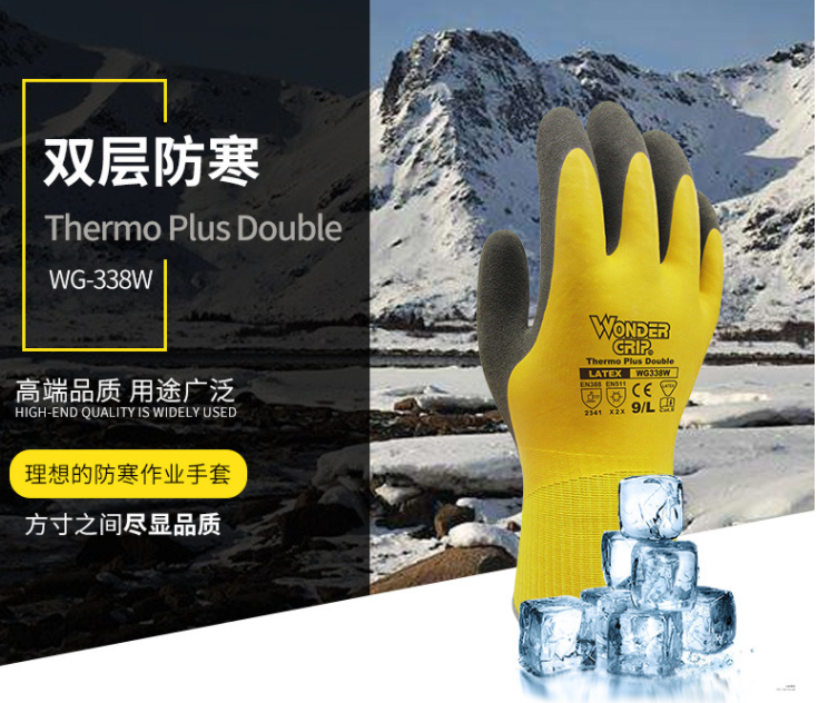 全浸双层天然乳胶磨砂涂层,有效防止冷气和水的渗透,为湿性环境提供优异的抓握力;