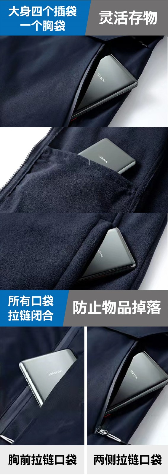 大身四个插袋和一个胸袋,可灵活存放物品,所有口袋拉链闭合,防止物品掉落;