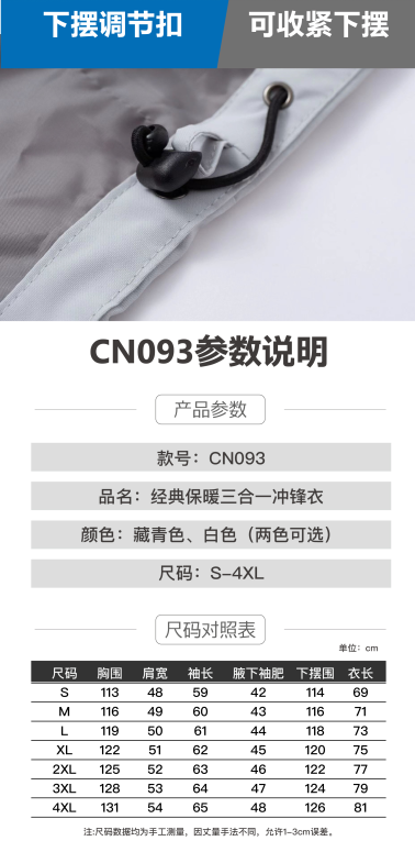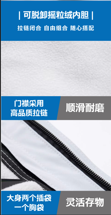 可脱卸摇粒绒内胆拉链闭合,自由组合,随心搭配;