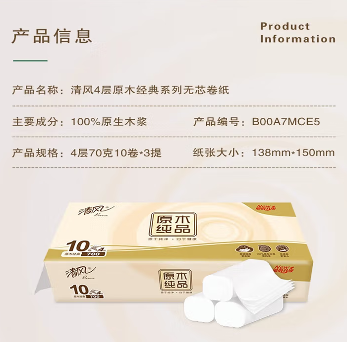 • 商品名称:清风 B00A7MCE5 无芯卷纸原木纯品70g*10卷