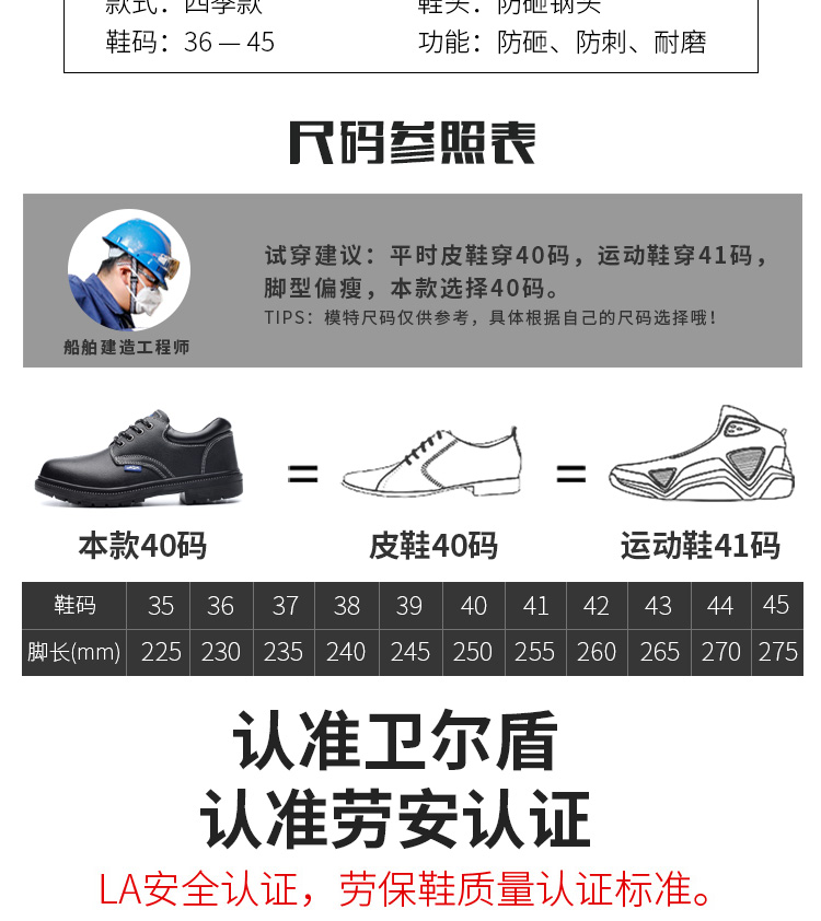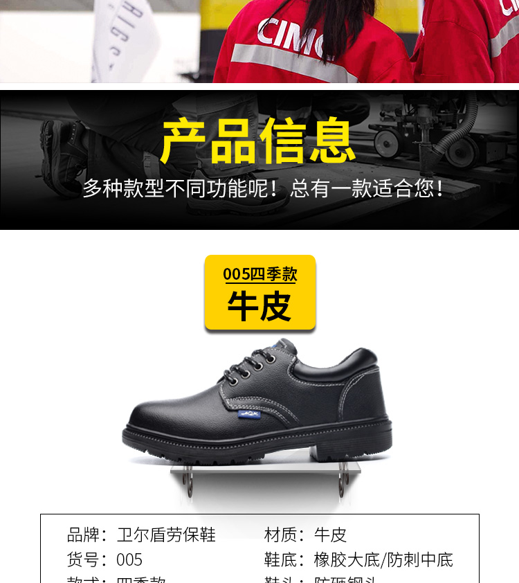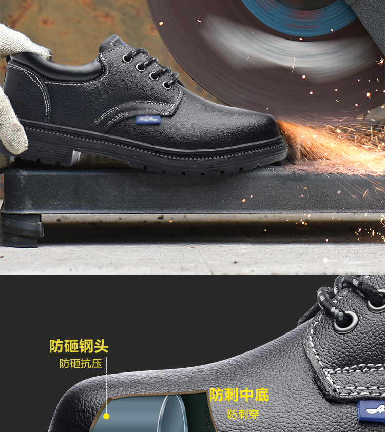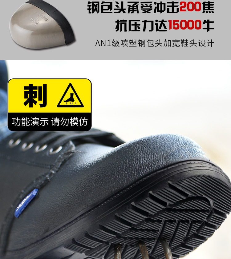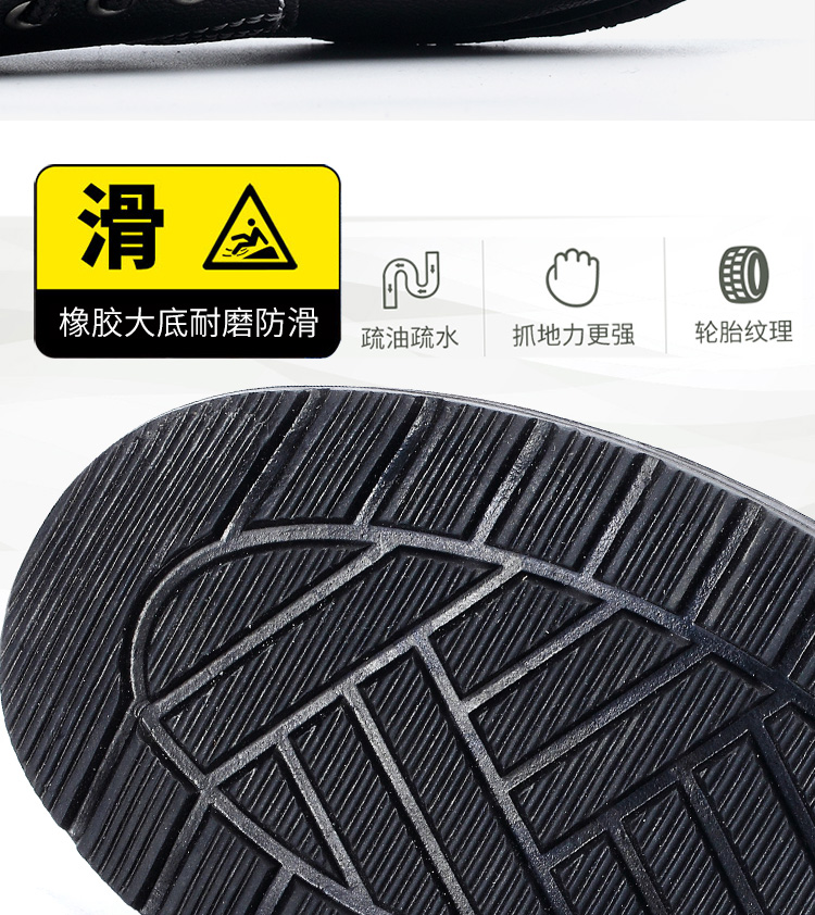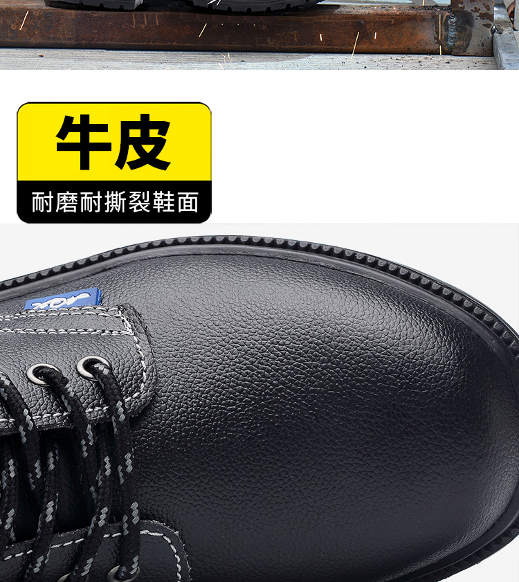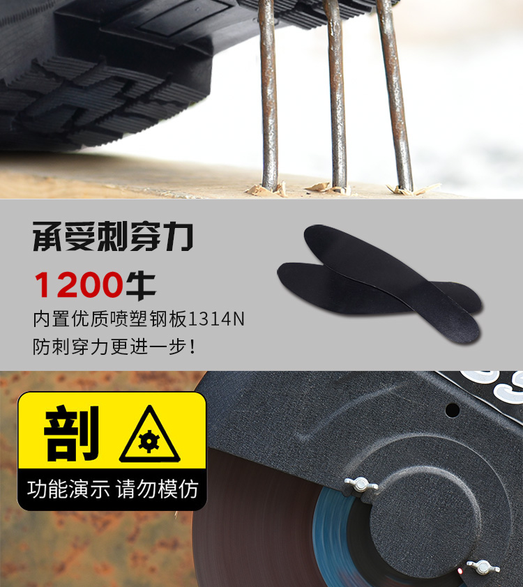 防砸钢头、防刺穿钢底、防滑橡胶底,防火花鞋面;