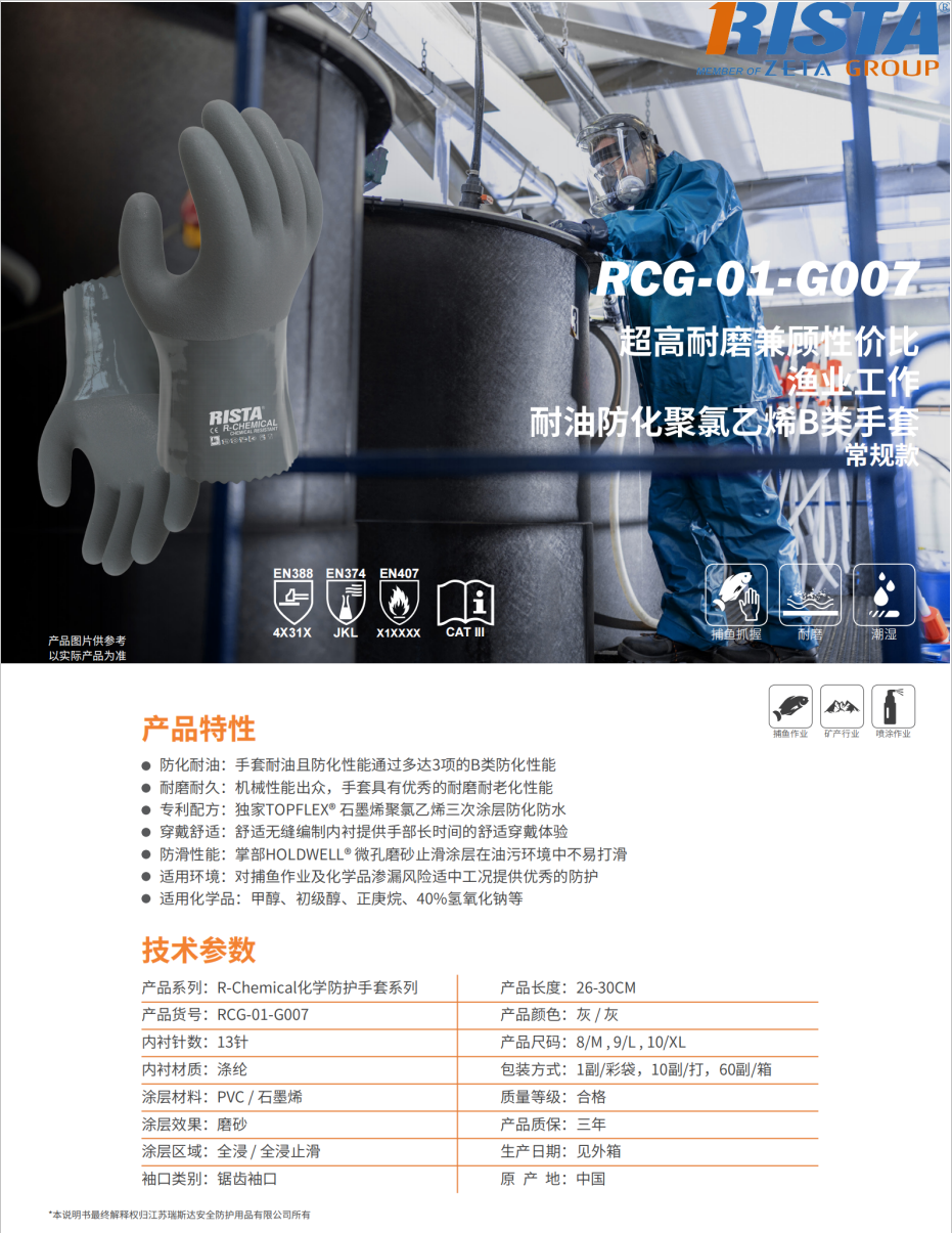 ●独特PVC石墨烯复合浸胶技术,提供超强耐磨、耐油、防化性能
