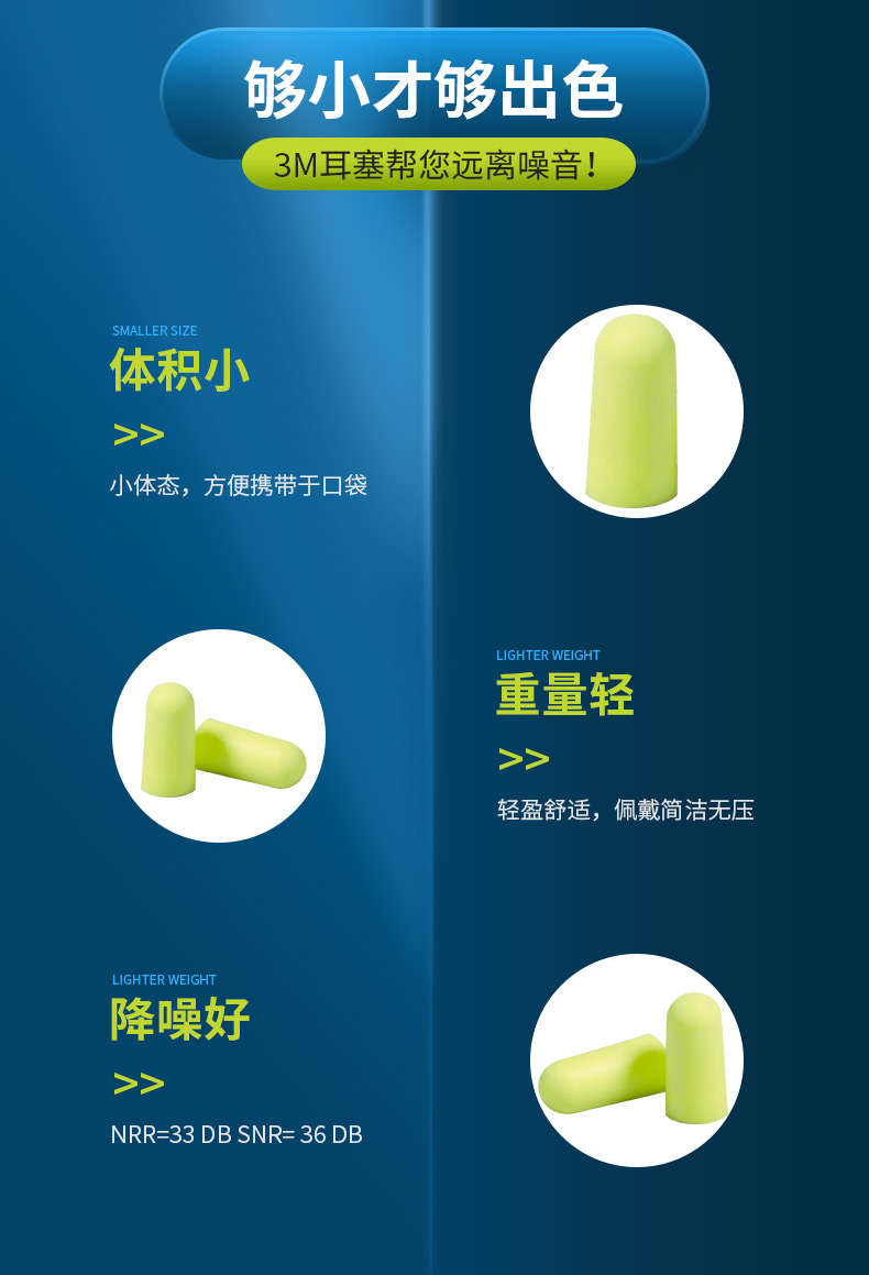 3M™ E-A-Rsoft™ Yellow Neons™ 耳塞采用柔软的、慢回弹泡棉,同耳道之间形成良好密封,在提供高降噪防护的同时满足舒适性;
