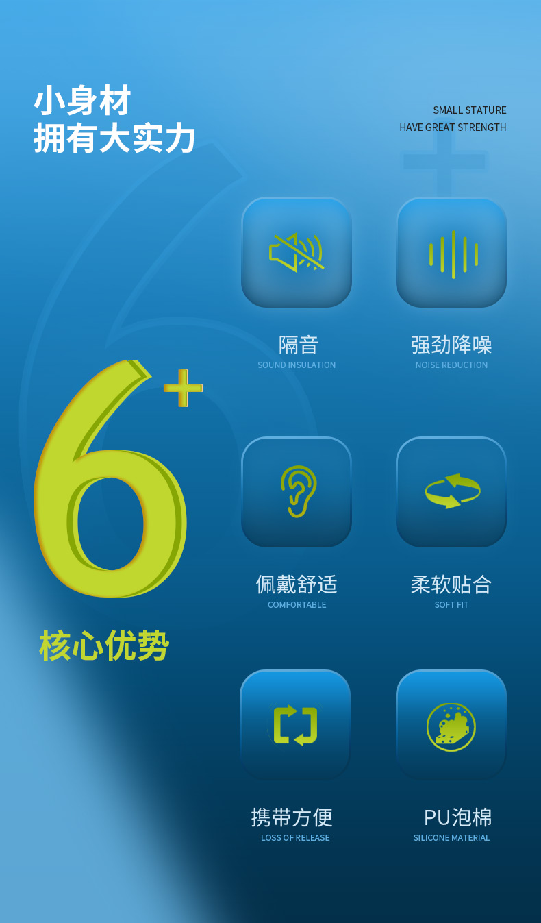 柔软、易揉搓的泡棉,适合长时间舒适佩戴;