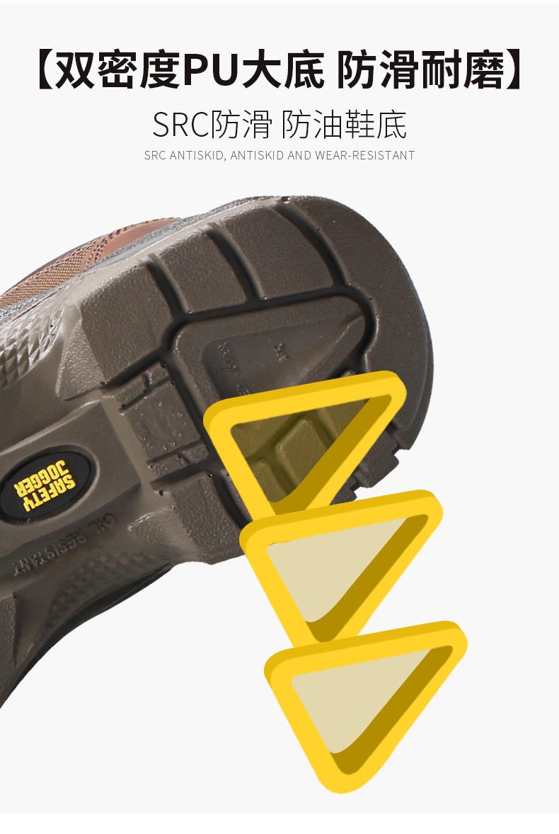 双密度聚氨酯双色 PU 大底,耐油污,具有超强的耐磨性、耐曲折性、耐撕裂性,防静电,减震吸能,欧标 S3 等级防水,SRC 欧标最高级别防滑;