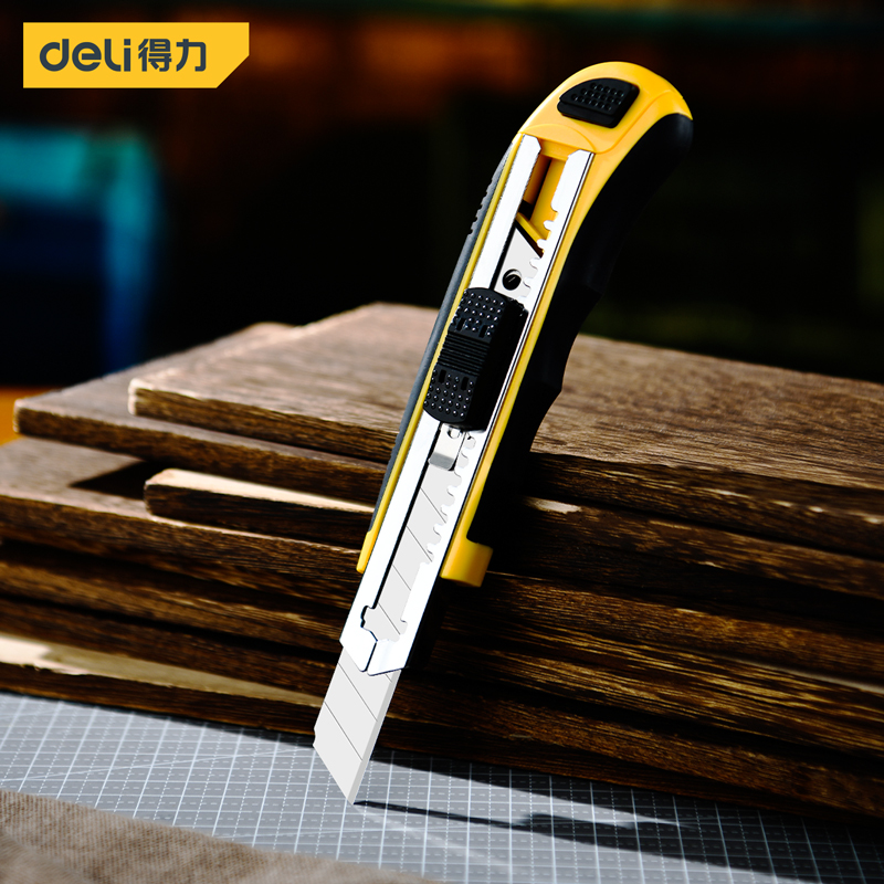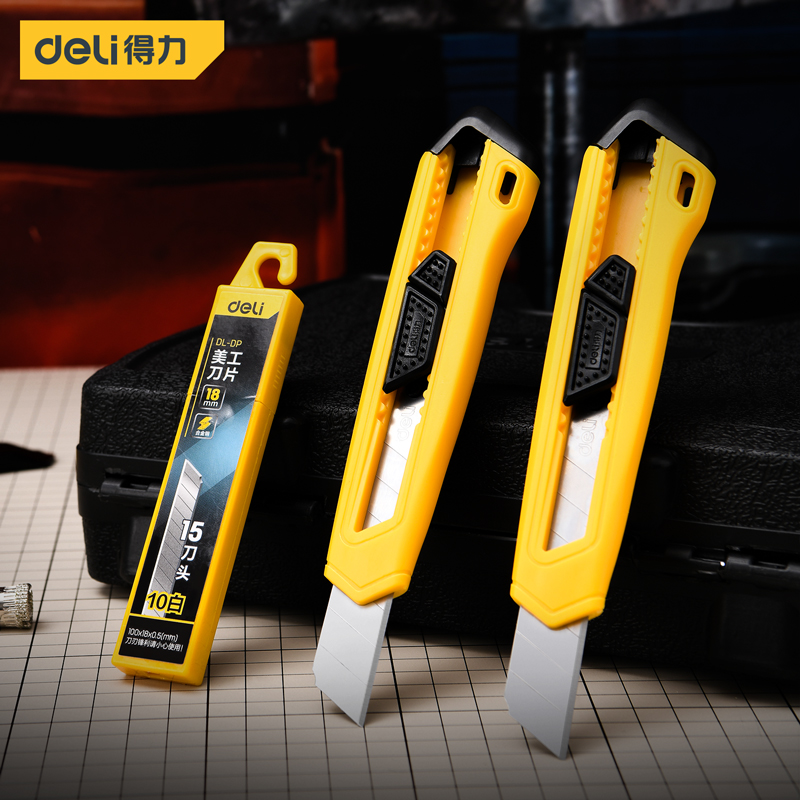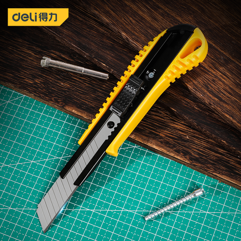 得力工具 塑柄美工刀旋钮内置两刀片(黄)