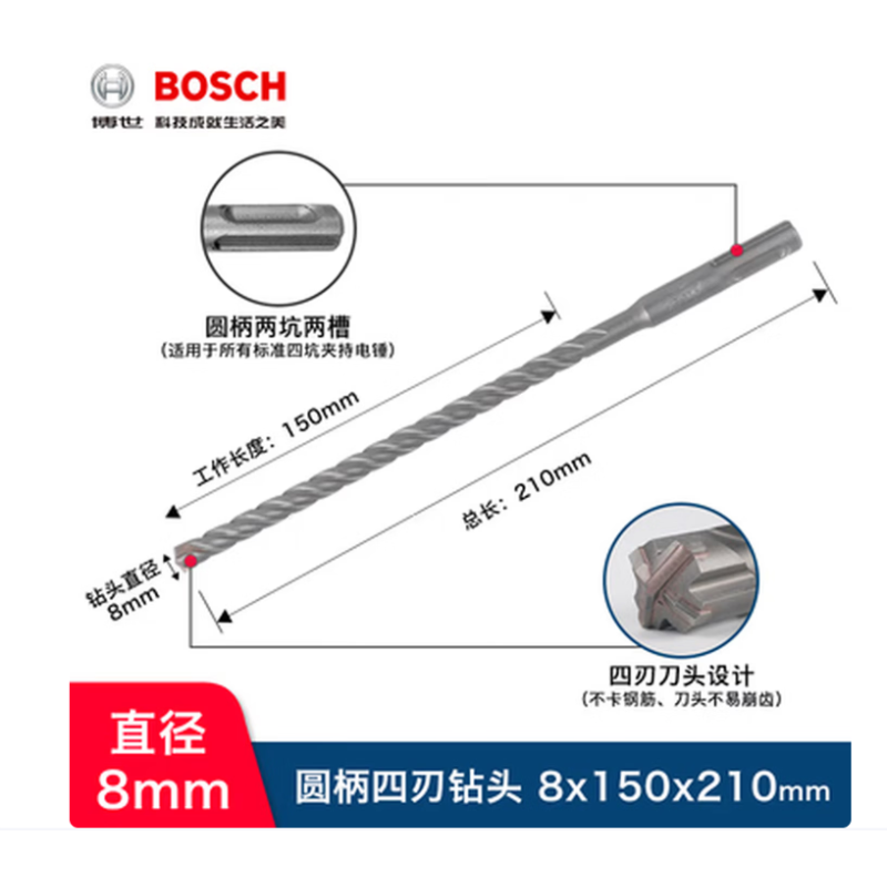 博世 2608706892 专业级四坑5系电锤钻头8x150x210