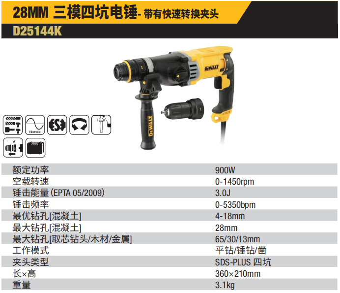 得伟 D25144K-A9 2KG 28mm 3模四坑电锤 快换夹头