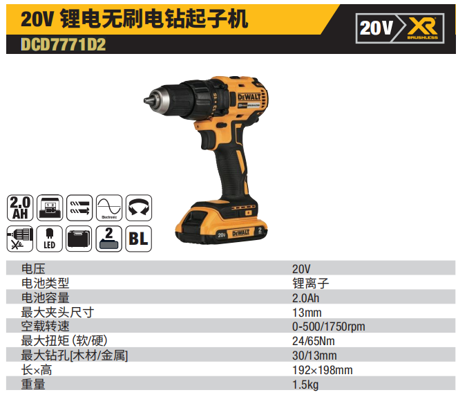 得伟 DCD771D2-A9 20V经济型锂电电钻起子 2x2.0Ah电池套装