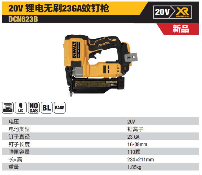 得伟 DCN623B 20V锂电无刷23GA蚊钉枪单机