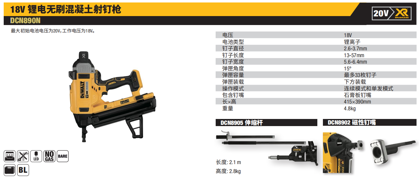 得伟 DCN890N-XJ-A9 20V锂电无刷混泥土枪钉枪单机纸盒装