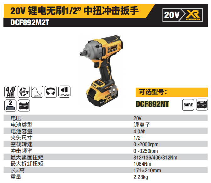 得伟 DCF922M2-A9 20V锂电无刷1/2紧凑型冲击扳手2x4.0Ah套装