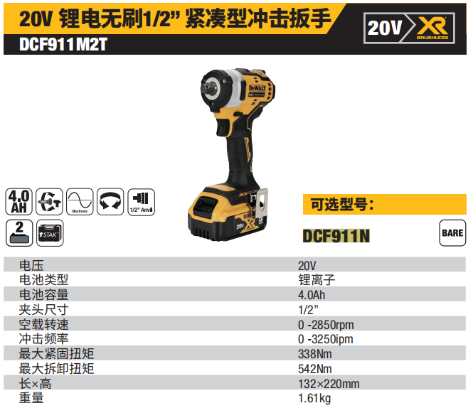 得伟 DCF911M2T-A9 20V锂电无刷1/2紧凑型冲击扳手2x4.0Ah套装