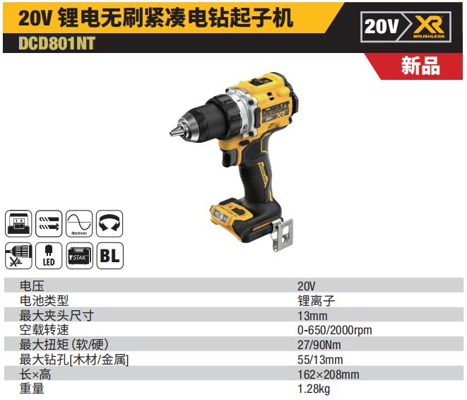 得伟 DCD801NT-A9 20V锂电无刷紧凑电钻起子单机TSTAK