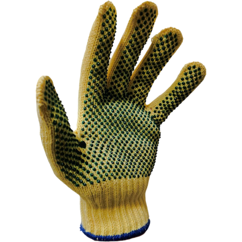 尺寸:均码 式样:点塑 涂层材料:PVC点塑 袖口:针织袖口(罗口) 颜色:黄色 耐磨等级:2级 防割等级:4级 耐撕裂等级:4级 杜邦™Kevlar®凯芙拉®纤维 防割 EN388