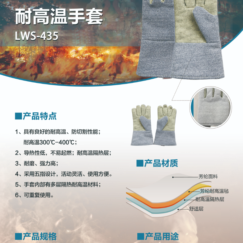 尺寸:均码 式样:铝箔覆层 多层隔热耐高温材料 涂层材料:铝箔 袖口:直筒袖口 颜色:双色 650℃ 耐高温