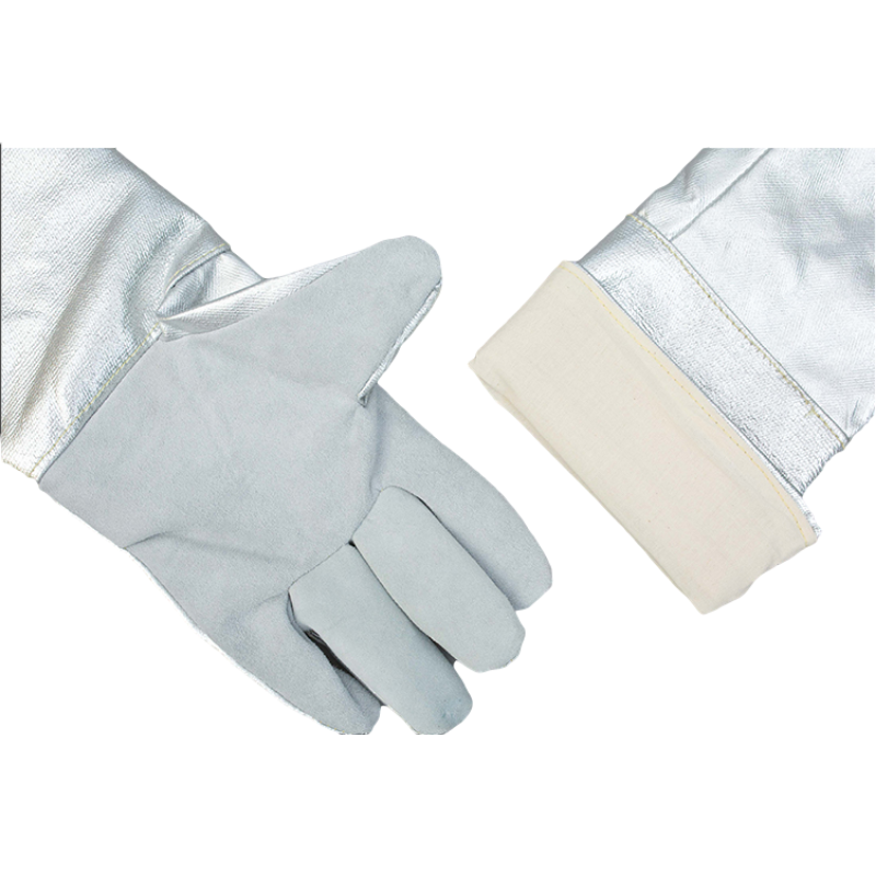 尺寸:均码 式样:铝箔覆层 铝箔防火布 涂层材料:铝箔 袖口:直筒袖口 颜色:银色 38cm 辐射热1000℃ 五指式 耐高温