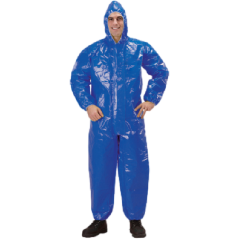 款式:连体 多层复合膜 防护级别:1类/A级 EN943-1 颜色:亮蓝色 尺寸:S CE 认证 热熔胶带 弹性收紧袖口 防化