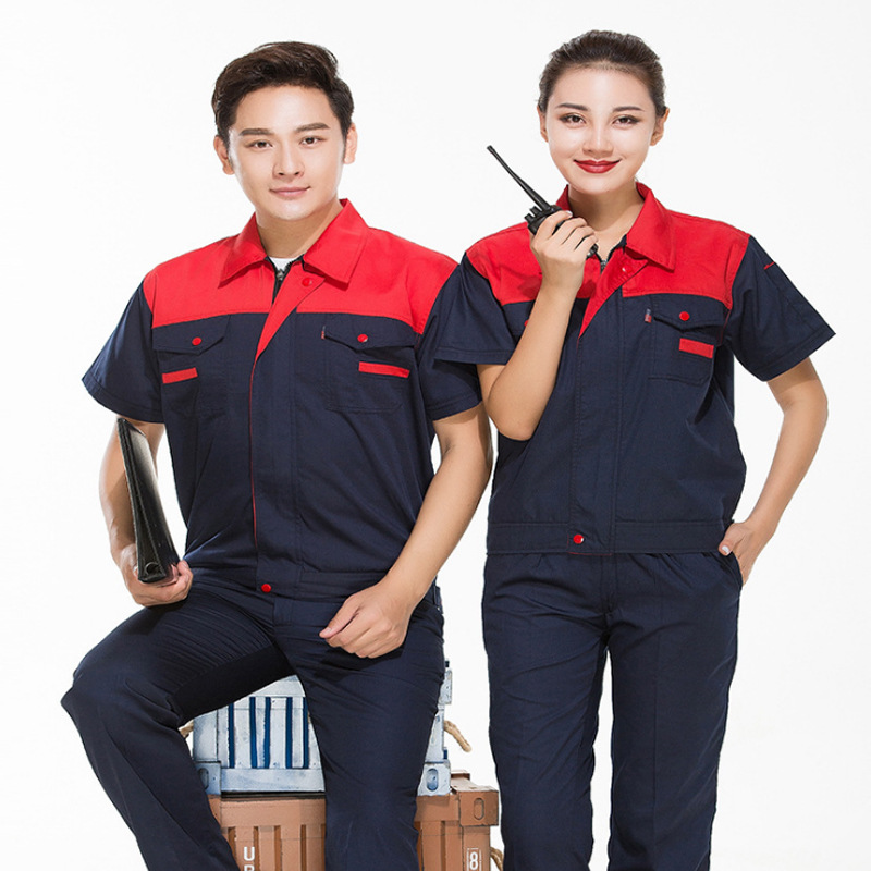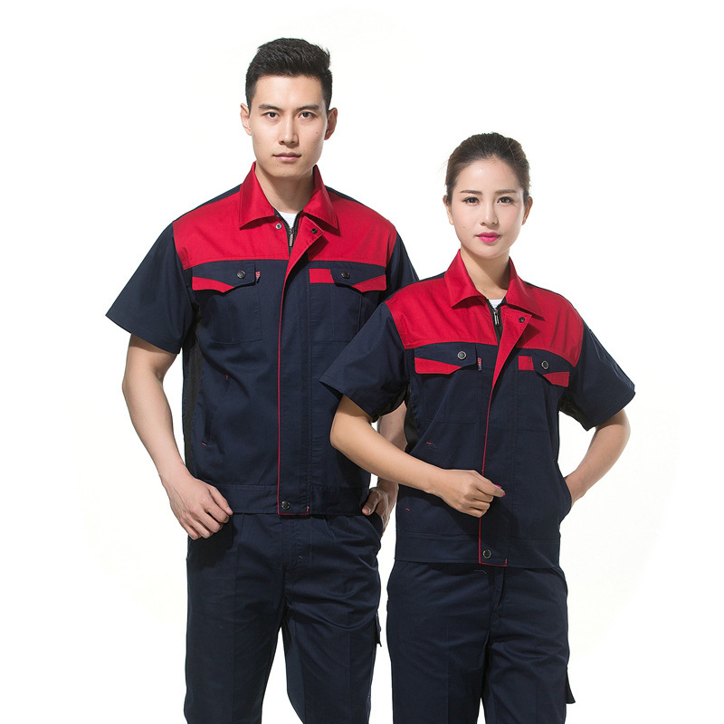 君御JY-S2402夏季全工艺涤棉薄款糖果拼接短袖工作服套装上红下藏蓝