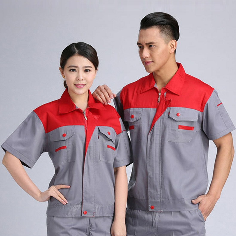君御JY-S2409夏季全工艺涤棉薄款糖果拼接短袖工作服套装上红下灰