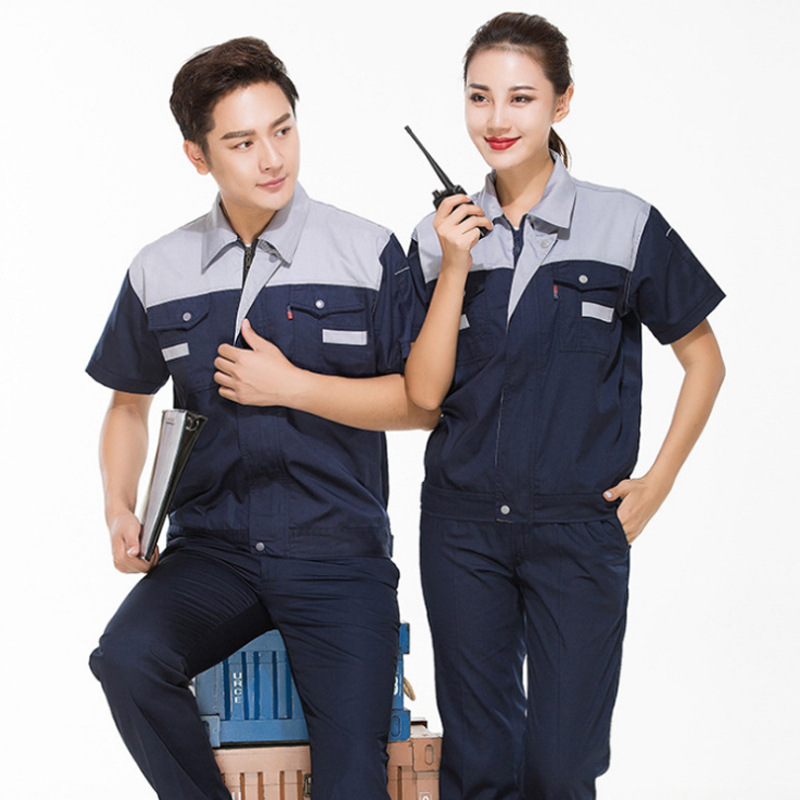 君御JY-S2407夏季全工艺涤棉薄款糖果拼接短袖工作服套装上灰下藏蓝