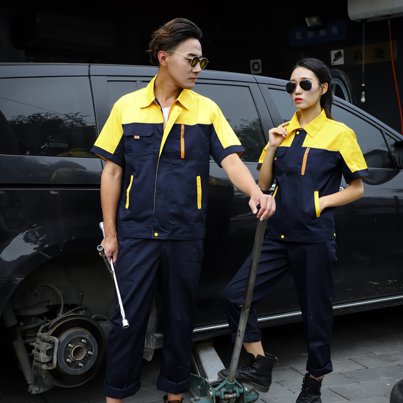 君御JY-S2401夏季全工艺涤棉薄款糖果拼接短袖工作服套装上黄下藏蓝