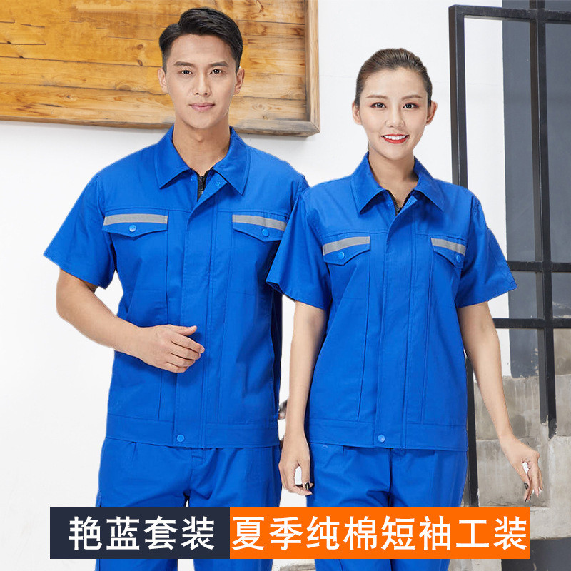 君御JY-纯棉S1002夏季全工艺薄款全棉反光条短袖工作服套装艳兰色