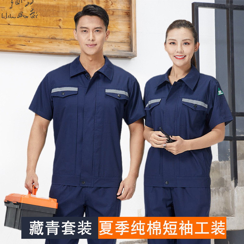 君御JY-纯棉S1001夏季全工艺薄款全棉反光条短袖工作服套装藏蓝色