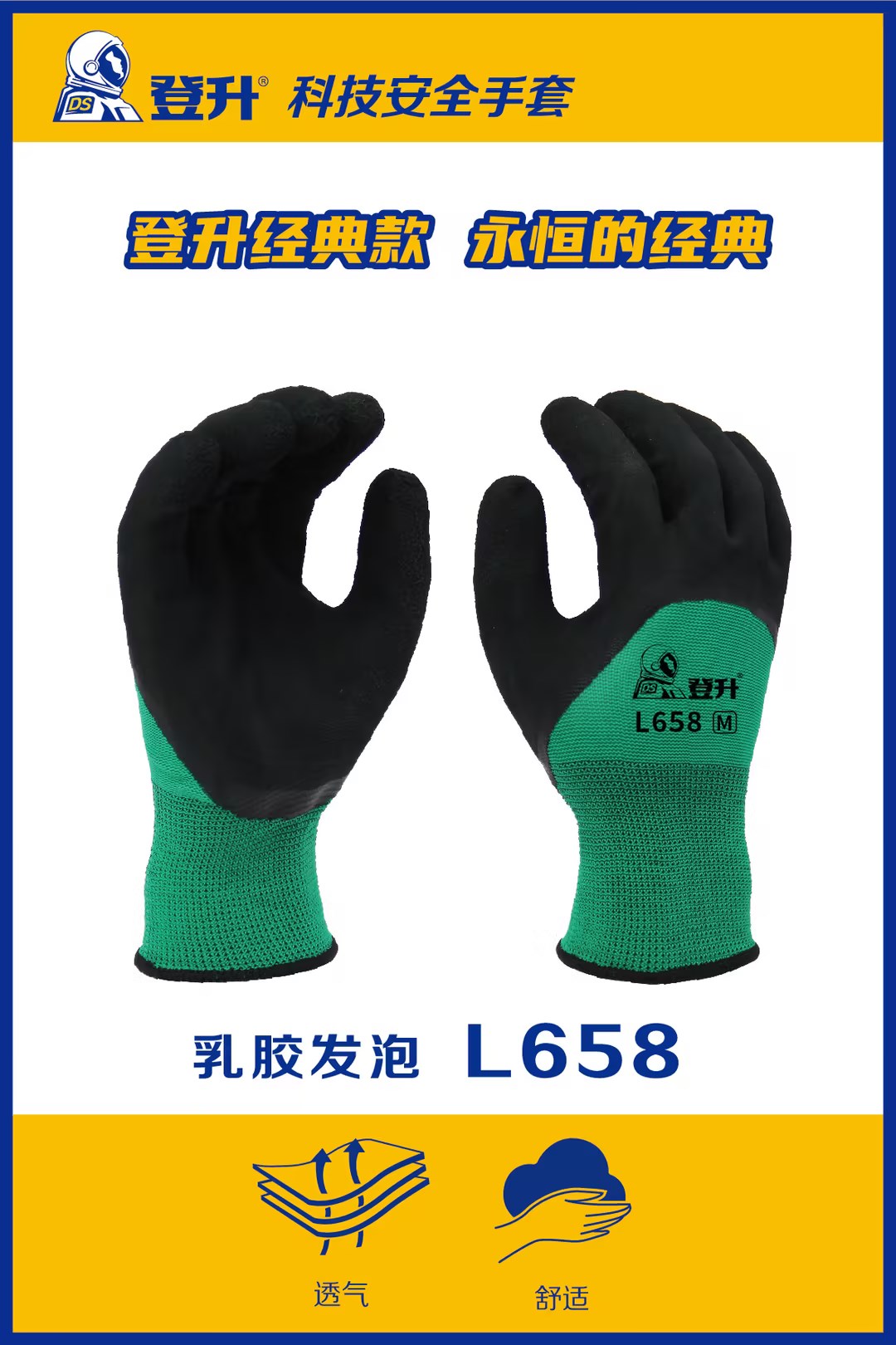 登升 L658 13针绿涤纶3/4浸黑色乳胶发泡