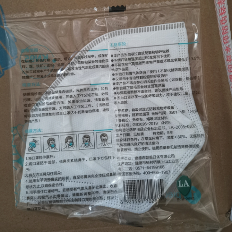 款式/类型:折叠式 佩戴方式:耳戴式 呼气阀:无 过滤等级:N95 颜色:白色 活性炭:否 GB19083-2010 保质期:2年 浙江建德