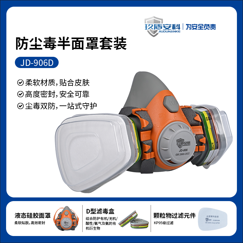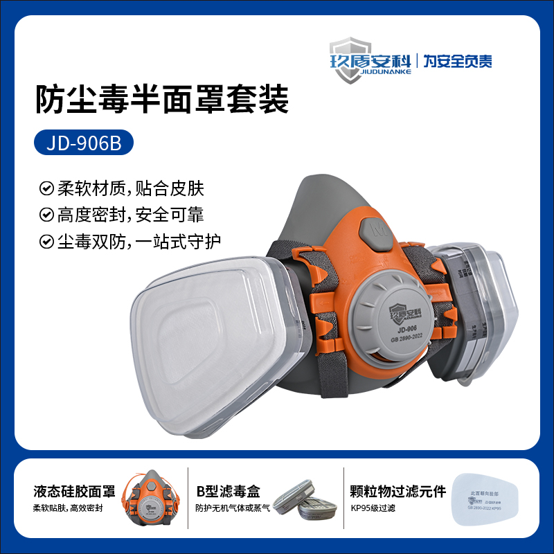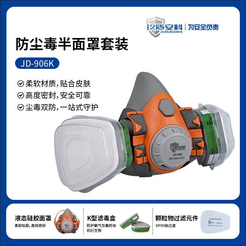 类型:半面罩 罩体材质:硅胶 尺寸:均码 JD-9000B; JD-9000B+JD-9295P 滤料连接方式:卡口式 滤盒:双滤盒/罐 河北沧州 KP95 橘灰色 全部零件可拆卸 头戴式 3年 GB2890-2022