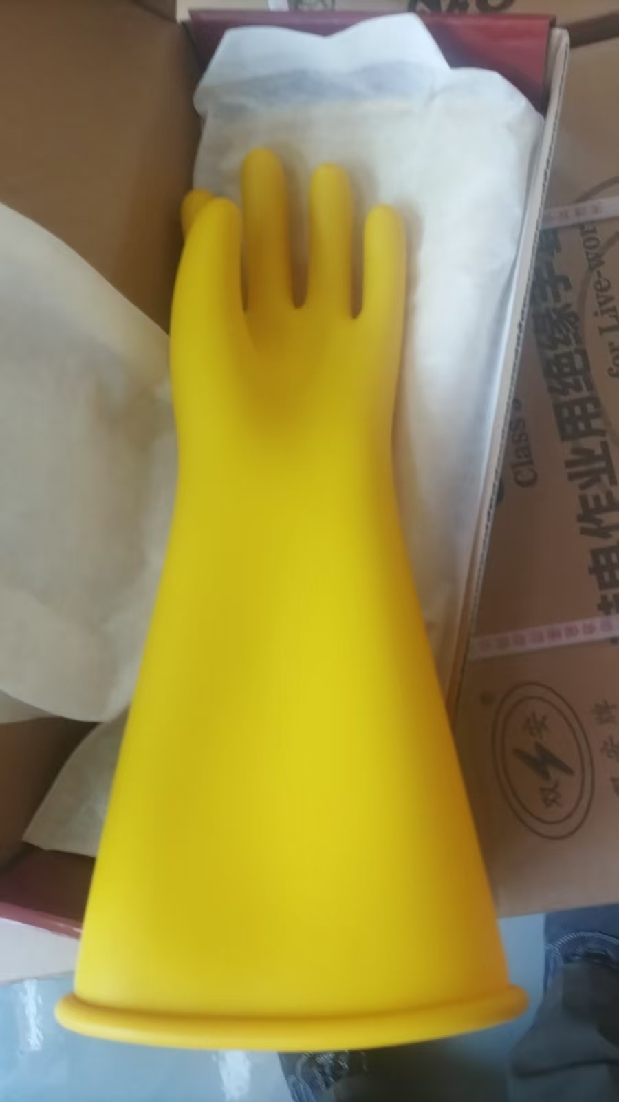 尺寸:均码 式样:全涂层 涂层材料:天然橡胶 袖口:直筒袖口 颜色:黄色 41cm 试验电压:40KV 35000V 电绝缘 GB/T17622-2008